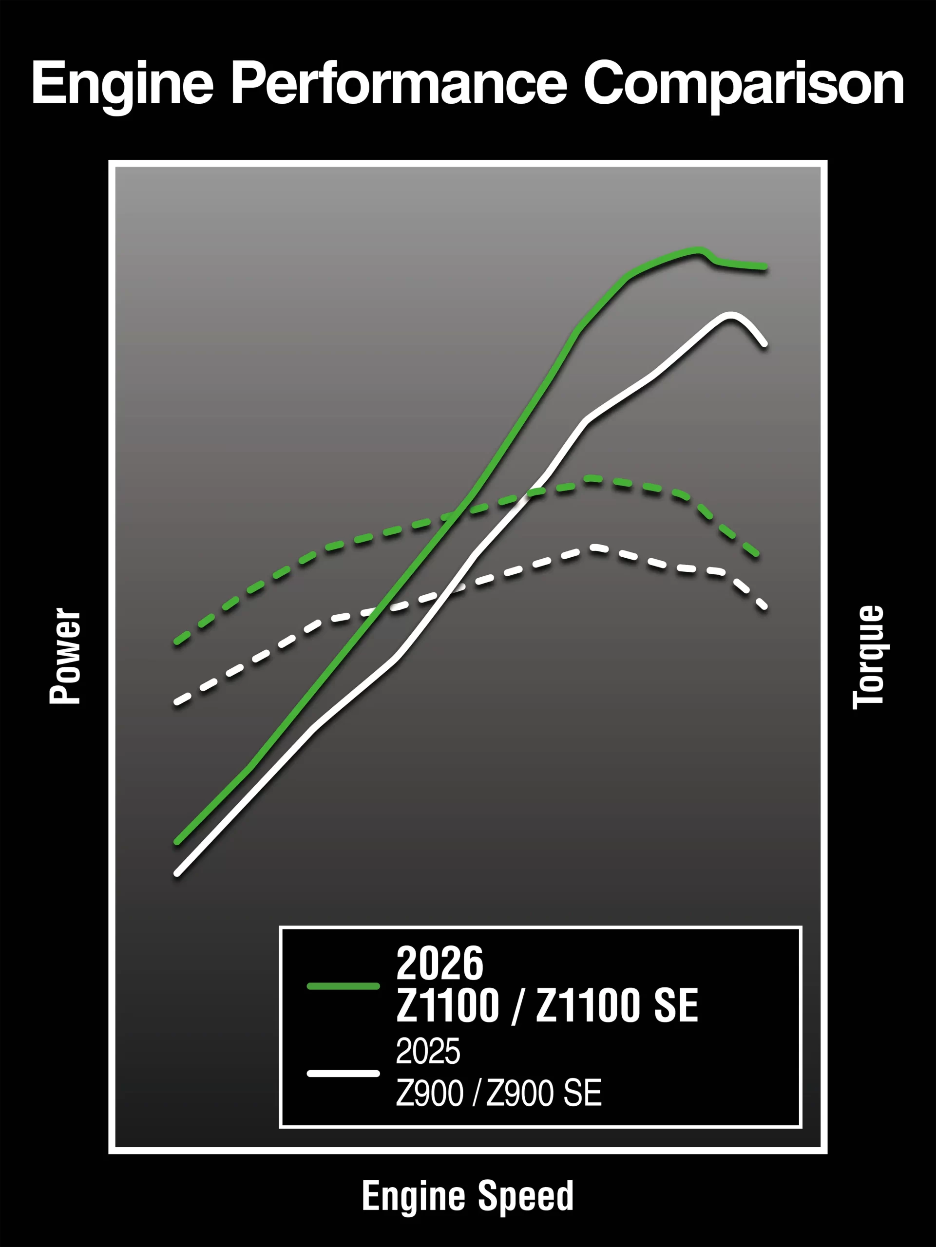 A Z1100 representa o auge da filosofia de desempenho e estilo Sugomi da Kawasaki, condensada em nosso modelo supernaked Z de maior cilindrada, assumindo seu lugar de direito como a nova líder da família Z de aspiração natural da Kawasaki. Essa predadora agachada está pronta para atacar com seu motor de 1.099 cc com torque superior, combinado a um impressionante conjunto de tecnologias avançadas de assistência ao piloto, atraindo motociclistas focados em desempenho e espírito esportivo que buscam experimentar o máximo em emoção e estímulo sensorial.